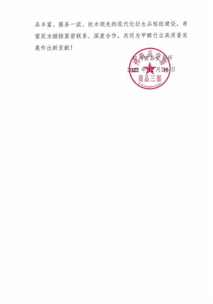近日,山東齊盛期貨有限公司收到了鄭州商品交易所的感謝信。信中對2022年我司高級分析師于芃森在市場調研、產業(yè)培訓、課題研究等方面給予了大力支持和幫助,為甲醇期貨相關工作的開展提供了有力保障表示了感謝,并一次性獎勵我司2萬元資金。