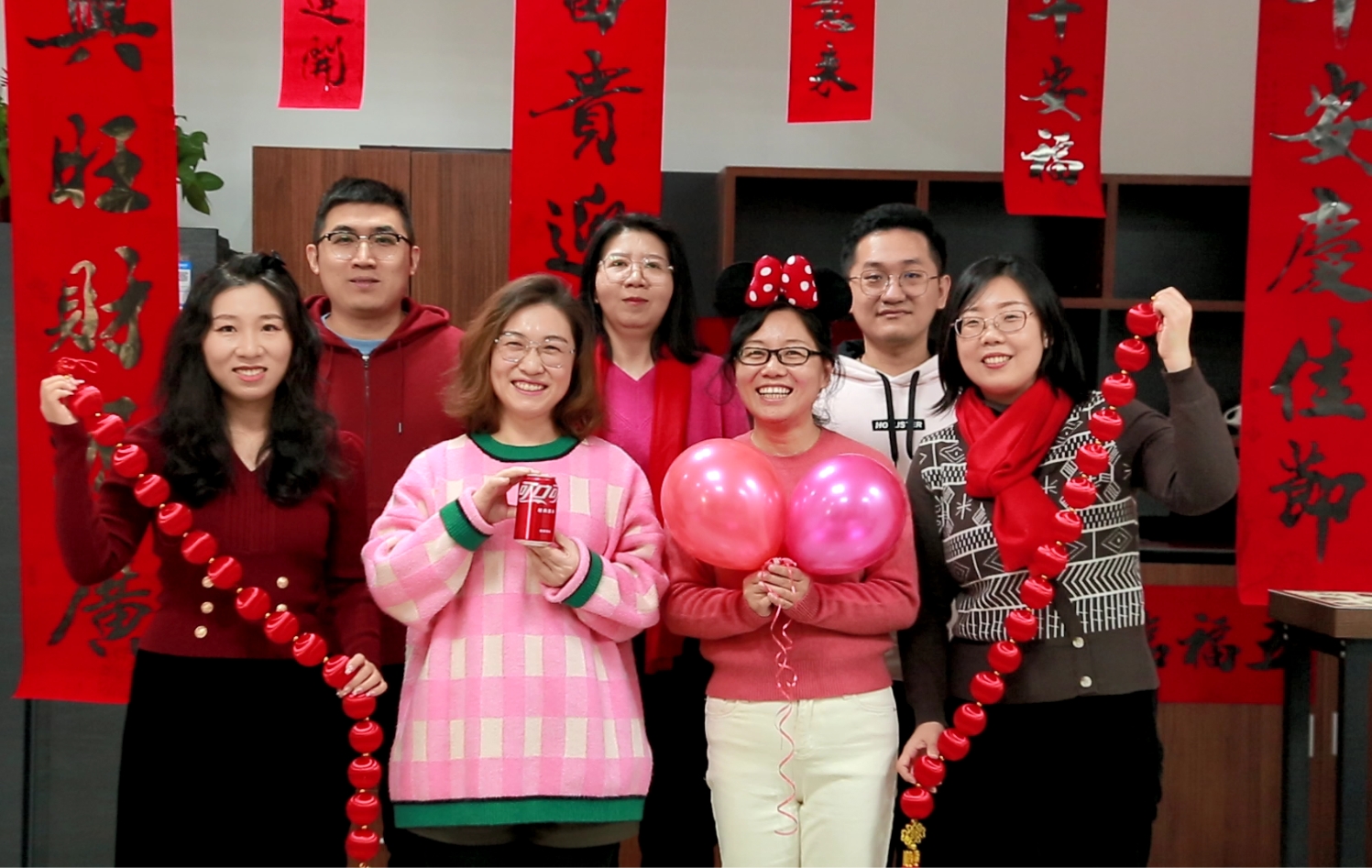公司前臺(tái)設(shè)置了百福圖區(qū)域,張貼了每位同事親筆書寫的新春小“?!弊?,公司經(jīng)營(yíng)層共同書寫新春對(duì)聯(lián),張貼至前臺(tái)處。隨后,經(jīng)營(yíng)層及總部員工共同合影留念,祈福新年新氣象,祝愿彼此新年快樂。