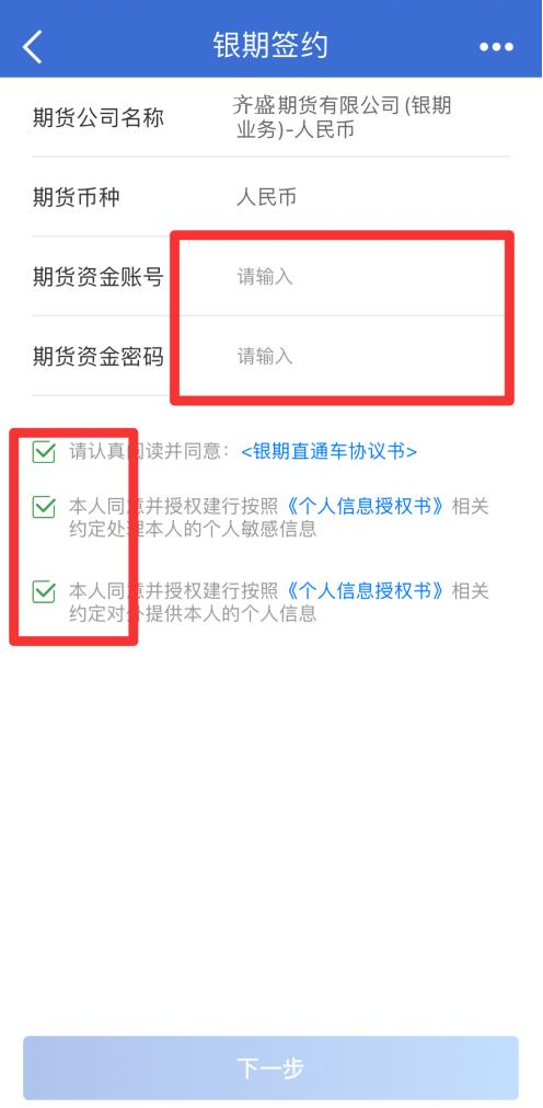 輸入資金賬號(hào)、資金密碼等信息后,勾選以下3個(gè)“請(qǐng)認(rèn)真閱讀并 同意”“本人同意并授權(quán)”,點(diǎn)擊“下一步”。