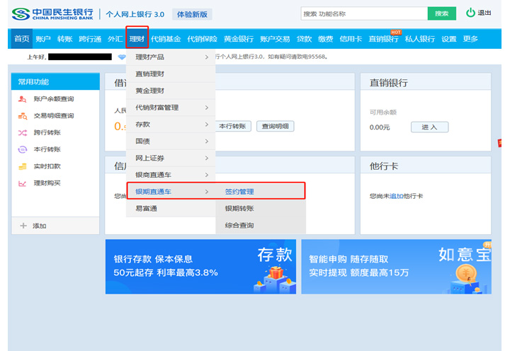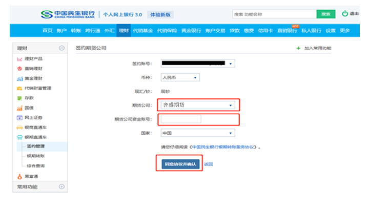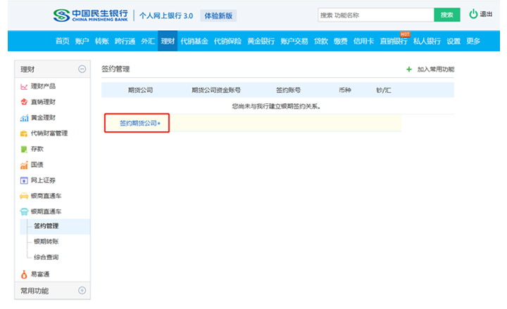 點(diǎn)擊菜單“投資理財(cái)—銀期直通車—簽約管理”。