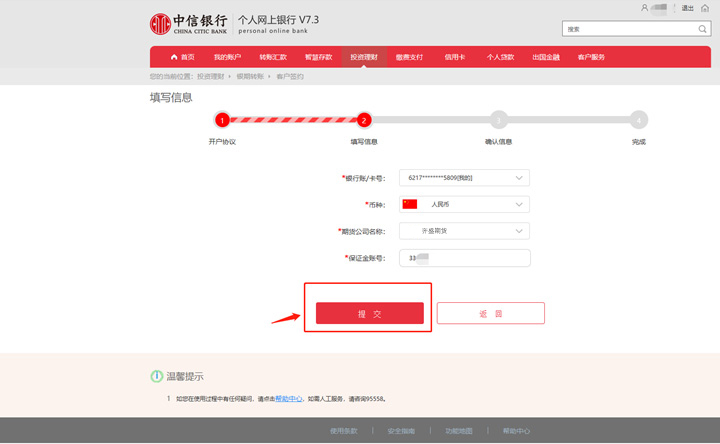 填寫信息-期貨公司選擇齊盛期貨-輸入保證金賬號-提交。